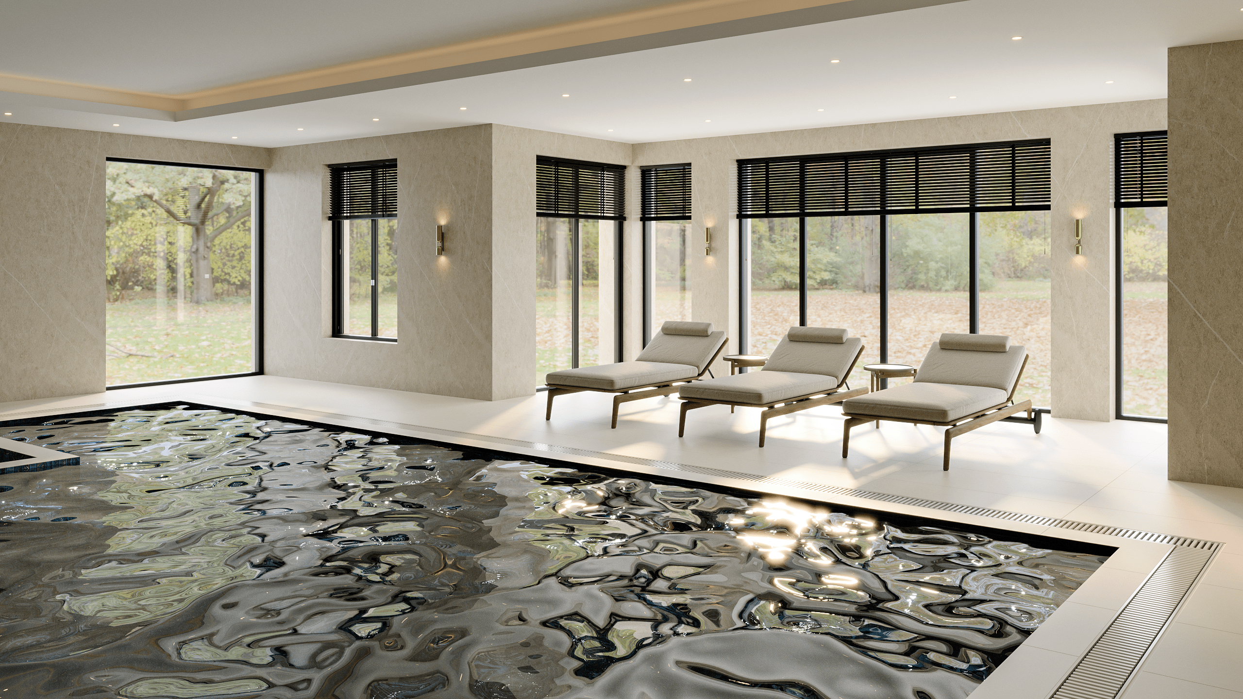 • Porcelain surfaces — high-performancelarge-format porcelain, in formats up to 3000mm x 1000mm, allows for near-seamless pool surround surfaces with exceptional durability and a refined, contemporary aesthetic.