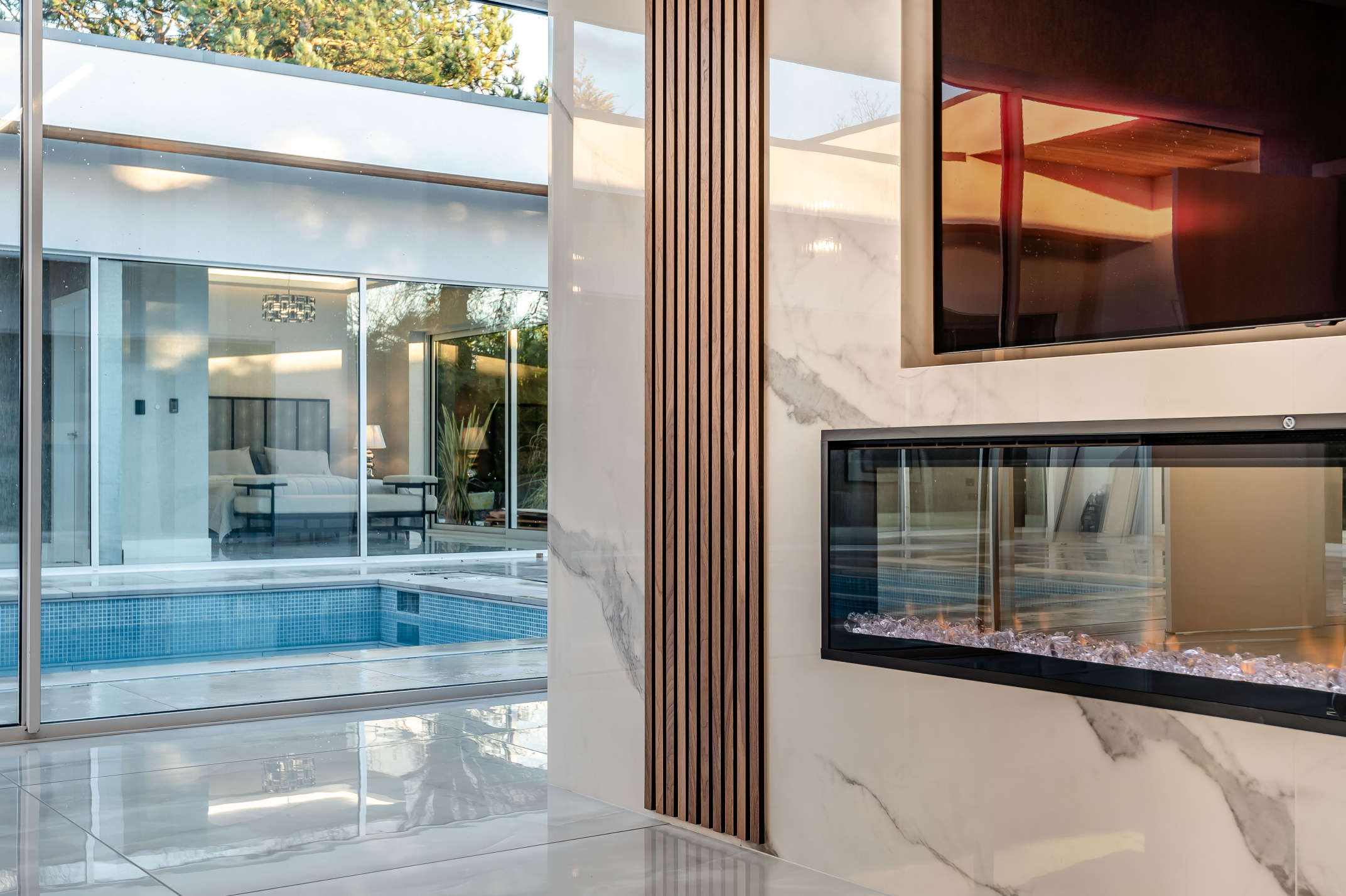 In every Meiger project that includes a pool, we design thetransition between the interior of the home and the pool space as a seamlesscontinuum. This means aligning floor levels, extending material palettes frominside to outside, and ensuring that the view to and from the pool isconsidered at the earliest stage of the architectural design. The pool is neveran afterthought — it is a primary element of the overall spatial composition.