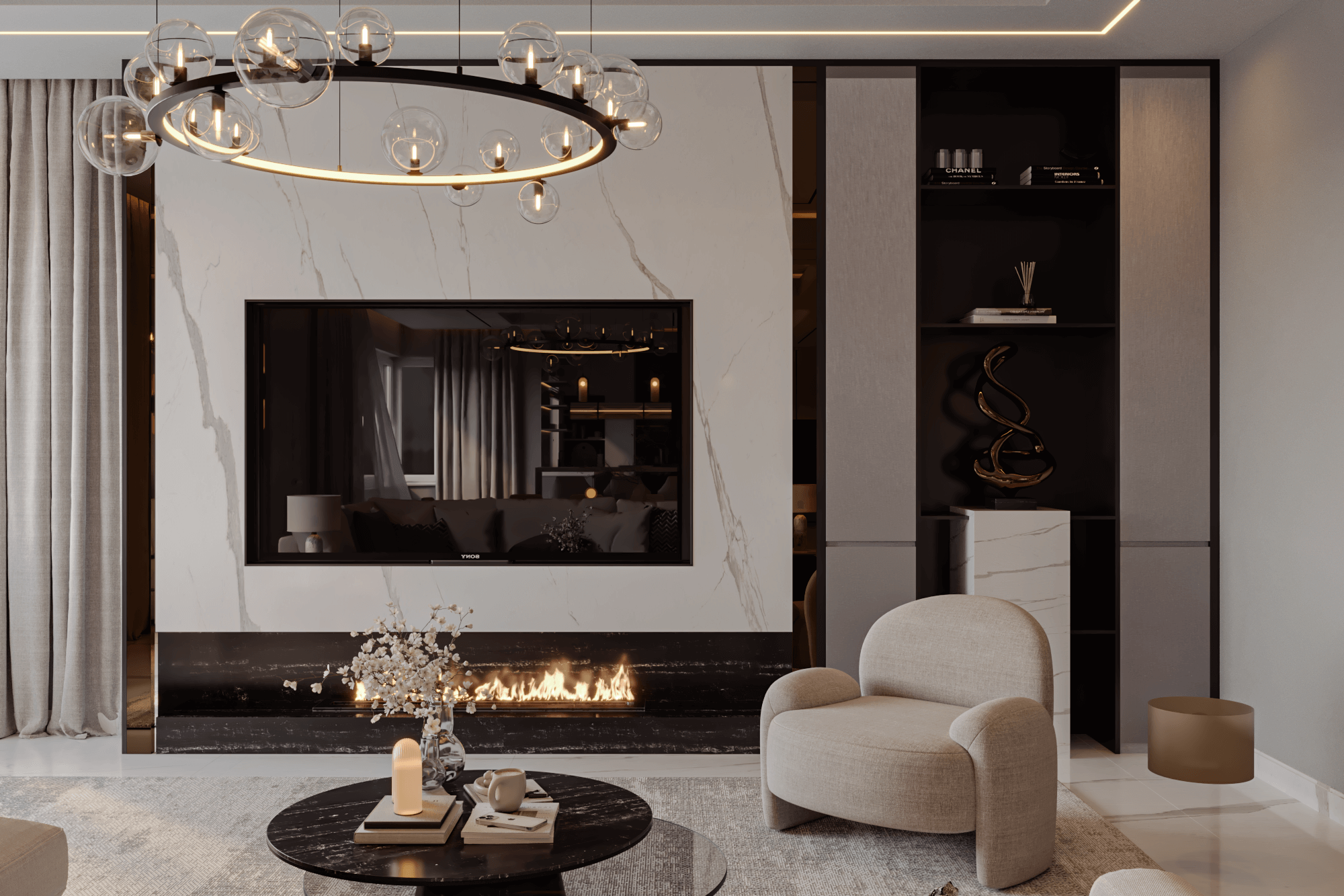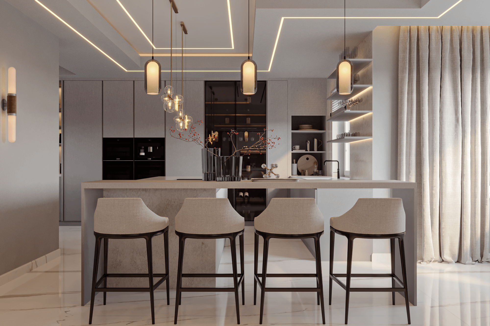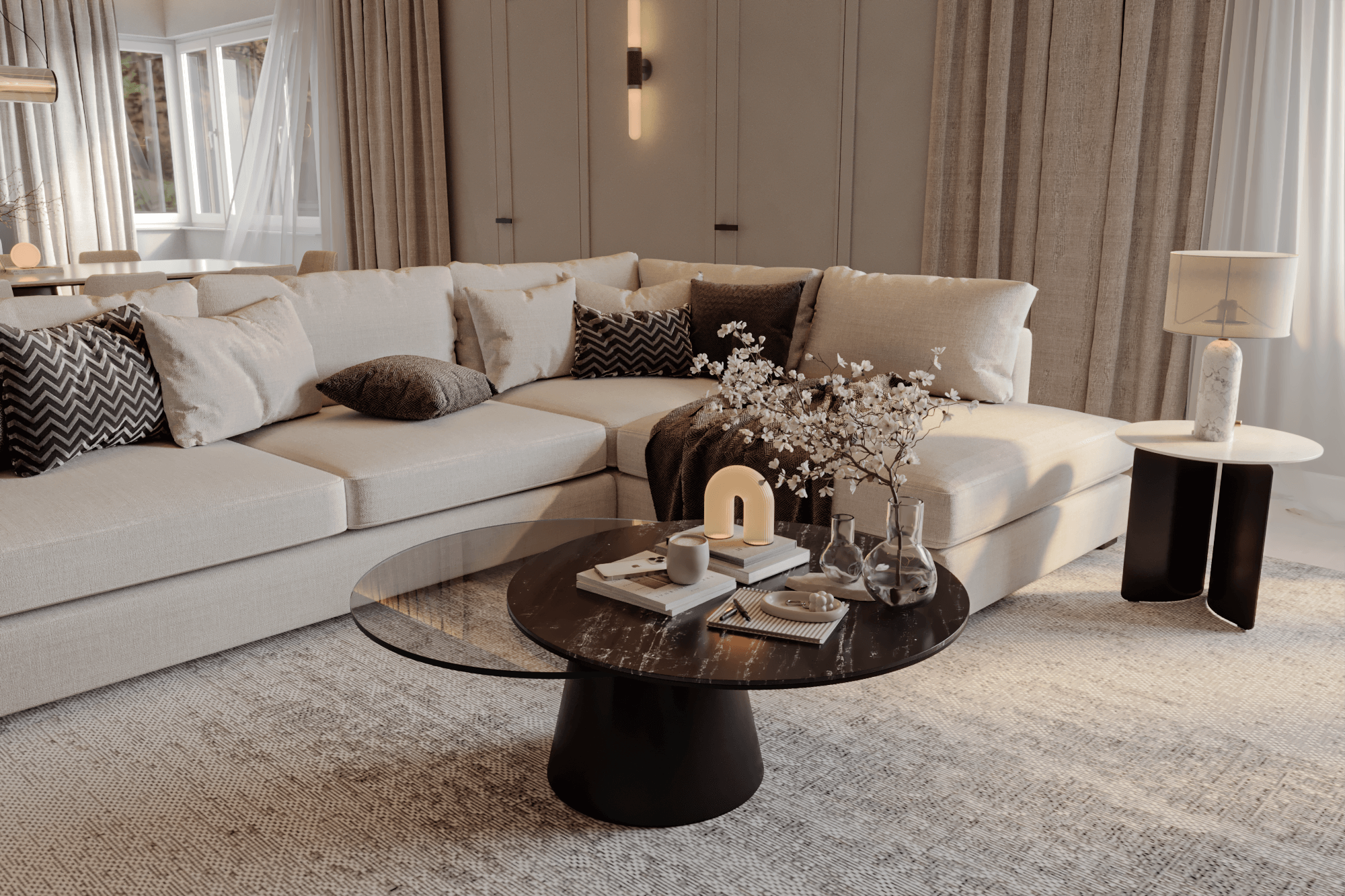 A showcase of Meiger’s haute couture approach to luxury living, this Isle of Man residence embodies calm precision and emotional harmony. Through our design lens, interiors are curated in creamy and beige tones, with low, confident furniture pieces framed by tailor-made curtains that capture the gentle movement of the wind. Proof that a house need not be vast to evoke a sense of infinity, elegance, and timeless comfort.