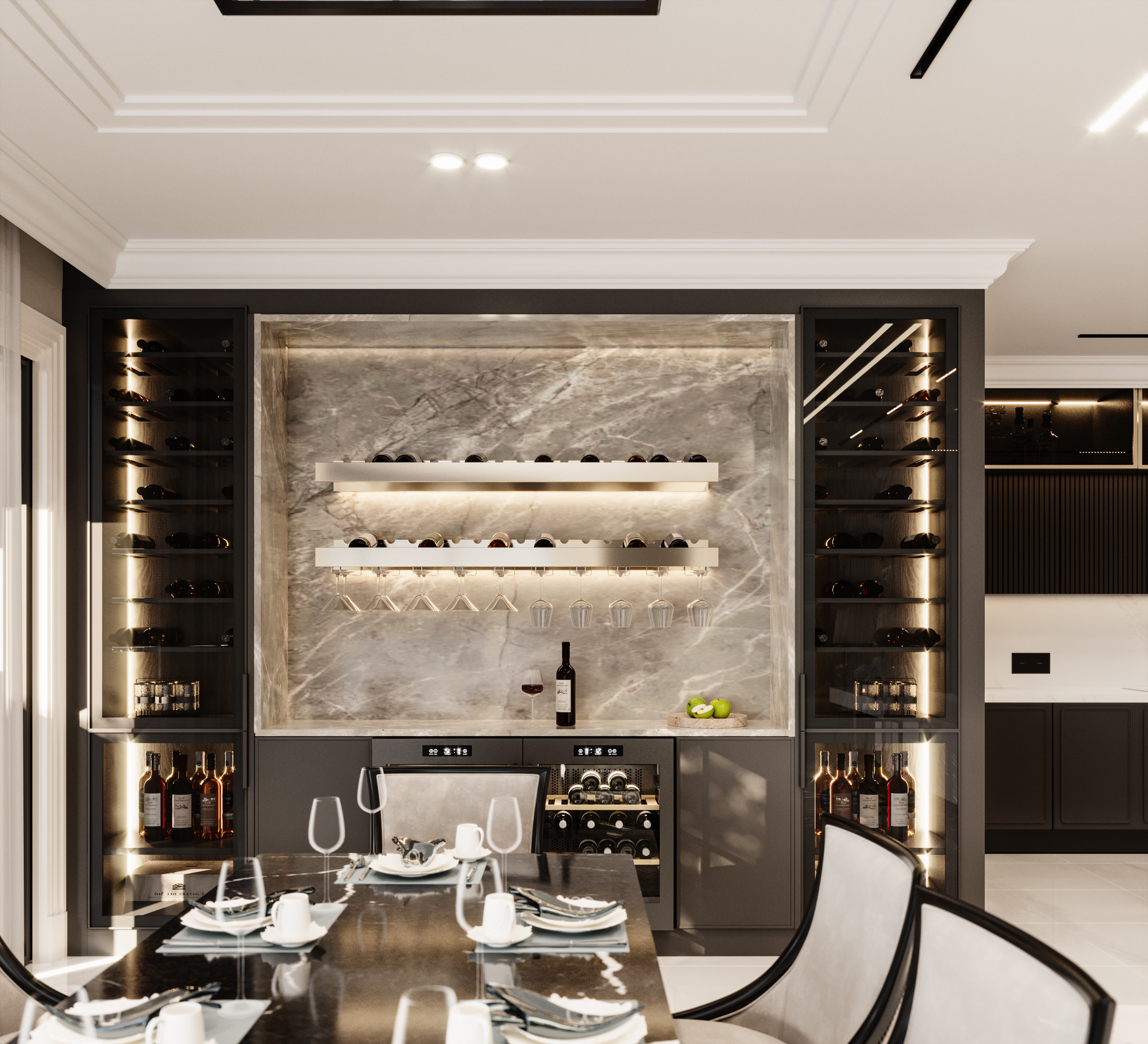 The centrepiece is a bespoke bar area, crafted exclusively for the homeowner—a true connoisseur of refined experiences. Anchored by a Spanish-style stone feature wall, the bar exudes earthy authenticity, while the brass-plated glass display introduces a luminous counterpoint of elegance and indulgence. Together, these elements evoke the spirit of Mediterranean craftsmanship reimagined with modern Italian sensibility, transforming the bar into both a functional retreat and a sculptural statement. This project reflects Meiger's core philosophy: interiors that merge function, artistry, and lifestyle, curating spaces that are timeless, immersive, and distinctly personal.